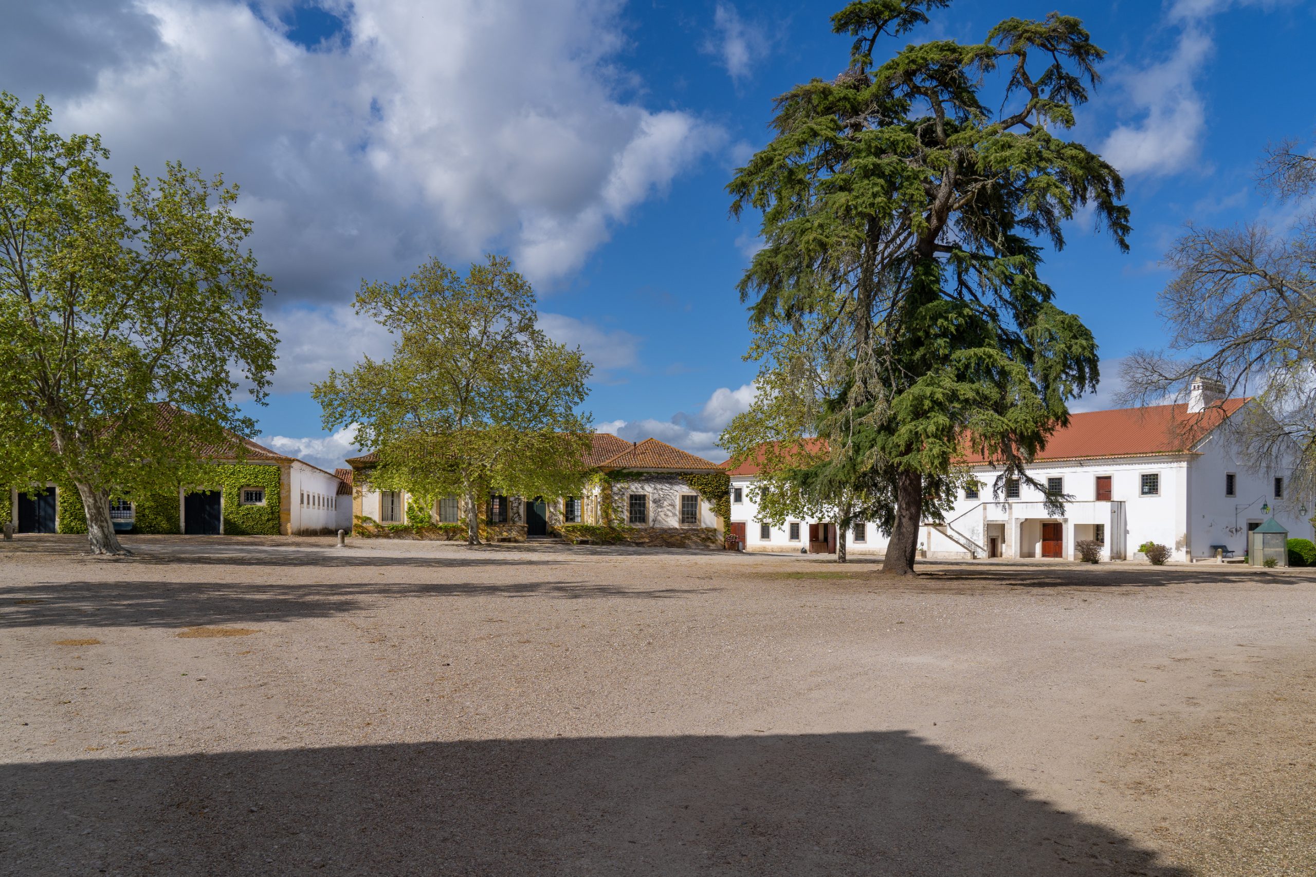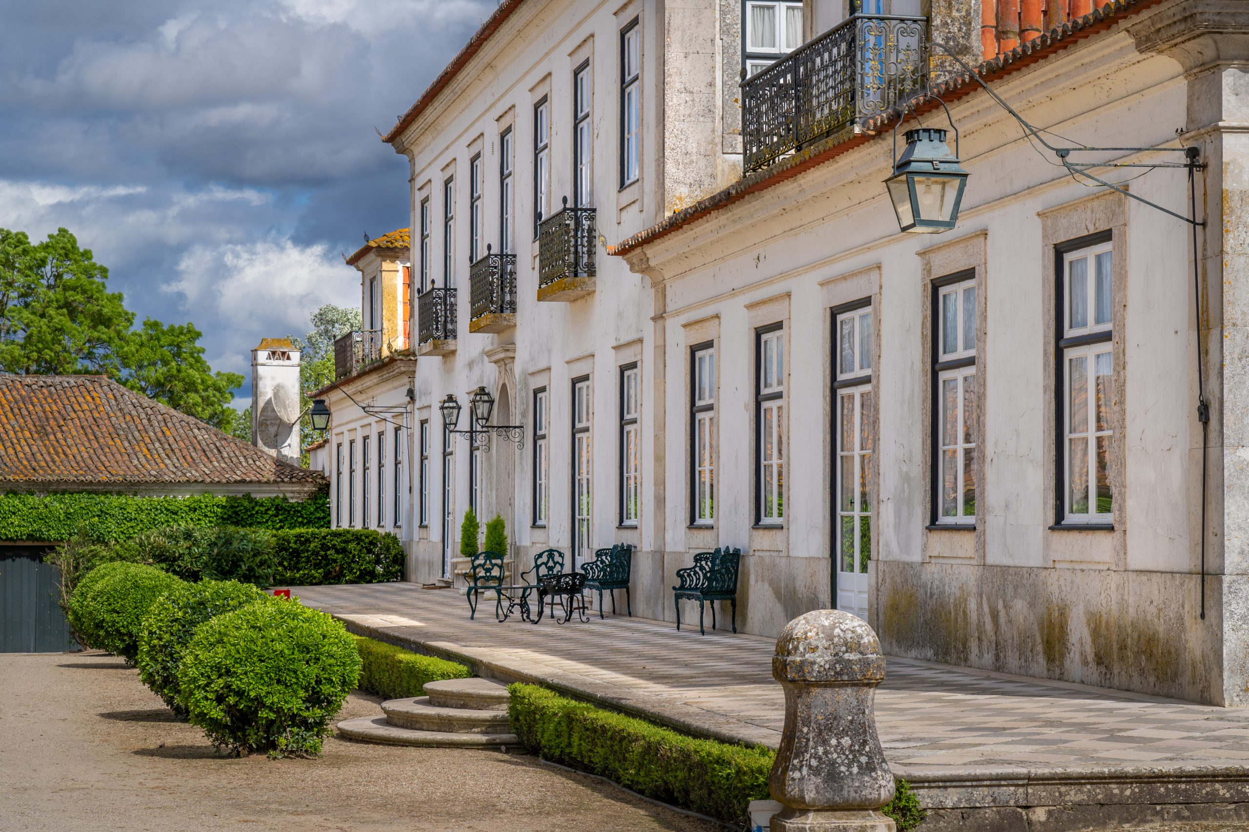 O palácio-residência, honrado que foi pelas visitas reais de D. Fernando de Saxe Coburgo-Gotha, e D. Pedro V, vê o seu alçado norte limitado por uma esplendorosa varanda, que olha a lezíria em toda sua magnificência, cujas paredes exibem painéis de azulejos da época e pinturas alegóricas à Agricultura, à Abundância, ao Comércio e à Indústria, que dão a ilusão a quem ao longe as observa, de estátuas em pedra, dentro de nichos. De destacar o trompe l'oeil, técnica artística muito presente em todo interior da casa, conferindo-lhe rara beleza, através de pinturas sobre o estuque, quer nas paredes, quer nos tectos, que integram cenas do mundo agricola, à época, entre outras, limitadas por falsos mármores, bem como, outros embelezamentos decorativos.