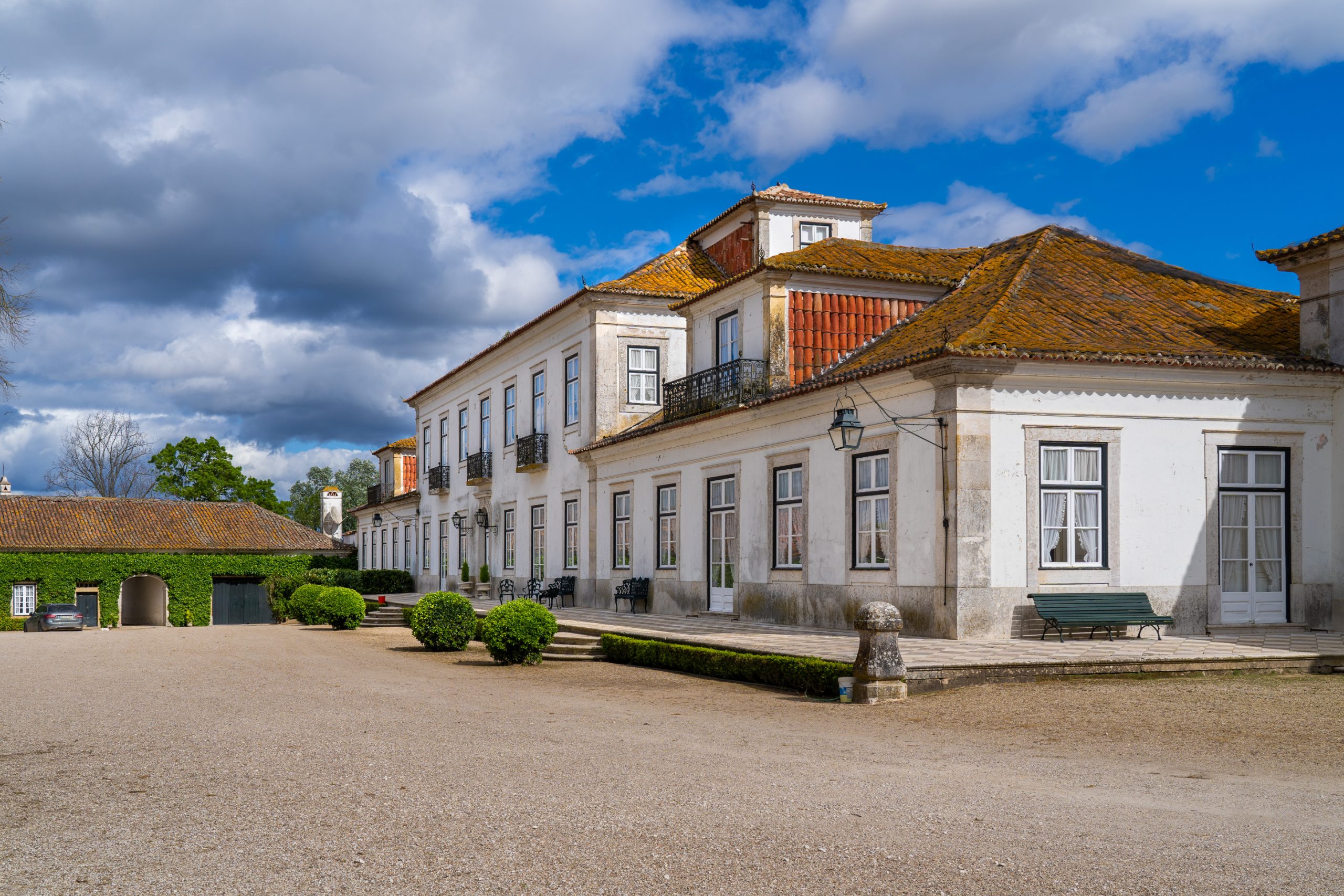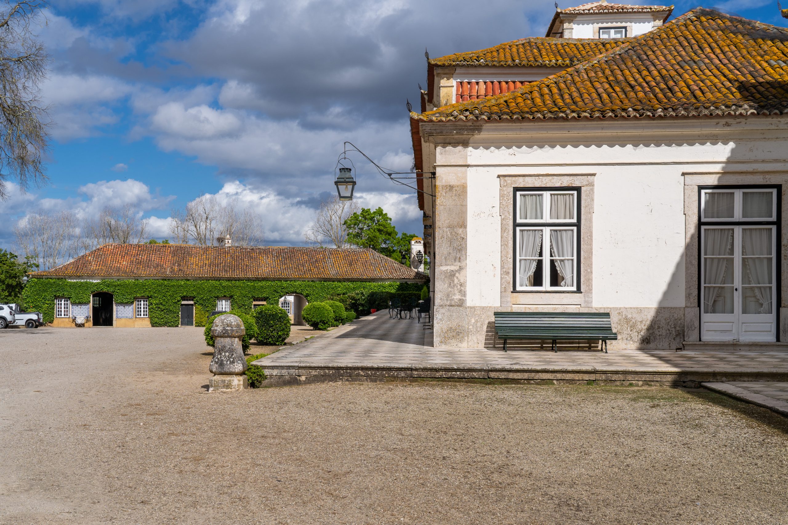 O palácio-residência, honrado que foi pelas visitas reais de D. Fernando de Saxe Coburgo-Gotha, e D. Pedro V, vê o seu alçado norte limitado por uma esplendorosa varanda, que olha a lezíria em toda sua magnificência, cujas paredes exibem painéis de azulejos da época e pinturas alegóricas à Agricultura, à Abundância, ao Comércio e à Indústria, que dão a ilusão a quem ao longe as observa, de estátuas em pedra, dentro de nichos. De destacar o trompe l'oeil, técnica artística muito presente em todo interior da casa, conferindo-lhe rara beleza, através de pinturas sobre o estuque, quer nas paredes, quer nos tectos, que integram cenas do mundo agricola, à época, entre outras, limitadas por falsos mármores, bem como, outros embelezamentos decorativos.